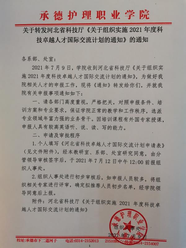 关于转发河北省科技厅《关于组织实施2021年度科技卓越人才国际交流计划的通知》的通知