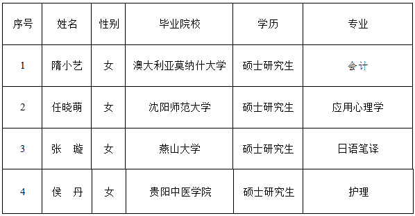 按照市委组织部、市人社局《关于印发< 承德市事业单位选聘高层次和急需紧缺人才暂行办法>的通知》(承人社[2014]23号)文件精神,按规定程序,历经报名、资格审查、面试、体检、政审等程序,现已进入公示阶段,经审核,共有隋小艺等4名符合聘用条件,现予公示。公示期七天(2019年4月28日—2019年5月4日),公示期满将办理聘用手续。如对公示结果有异议,欢迎监督举报。
