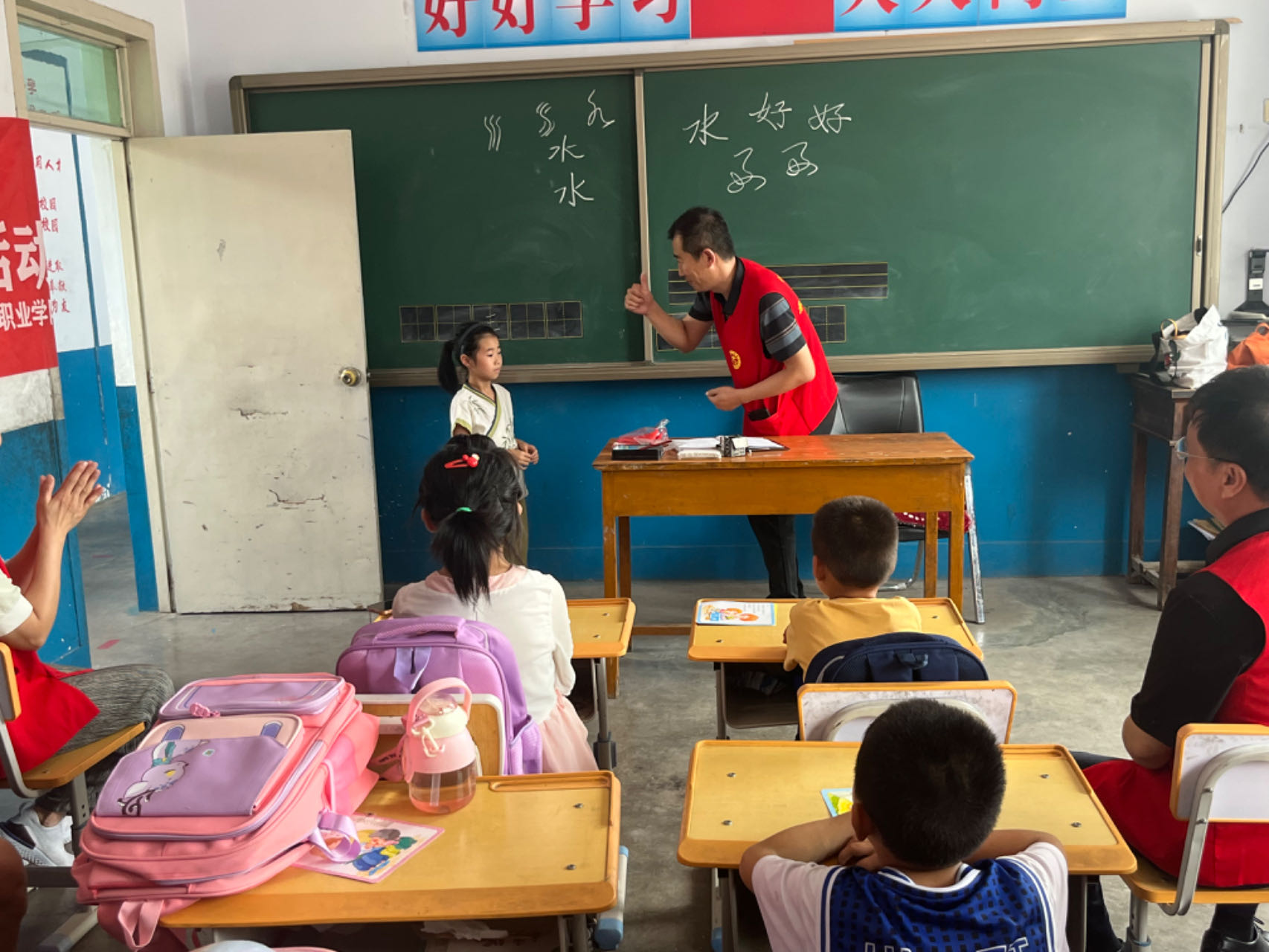 活动中,支部成员向椤台村小学学生捐赠书包、字帖、彩笔等学习用具7套。党支部纪检委员、学校网络安全与信息化中心主任邢淑兰围绕暑期防溺水、交通出行等安全教育,从如何预防溺水、开展救助等知识进行宣传教育,并通过问答互动等方式,使防溺水“六不准”入脑入心。工会副主席田伟用动听的歌声传递温暖,教唱古诗手势舞《小池》和红色童谣《小红花》,学生们边学边唱,教室里弥漫着欢声笑语,同时也加深了学生们对党和祖国的热爱之情。苗玉东为学生们带来一堂精彩的书法知识讲座,从中华文字的起源,到篆隶楷行草五种不同的字体,从老师的精彩示范,到学生们积极踊跃的亲自动手参与,极大激发了学生们对中华传统文化的学习兴趣,同时也正确引导学生养成正确的书写习惯,培养高雅的艺术趣味和良好的审美素养。