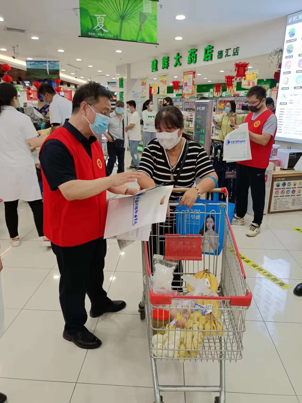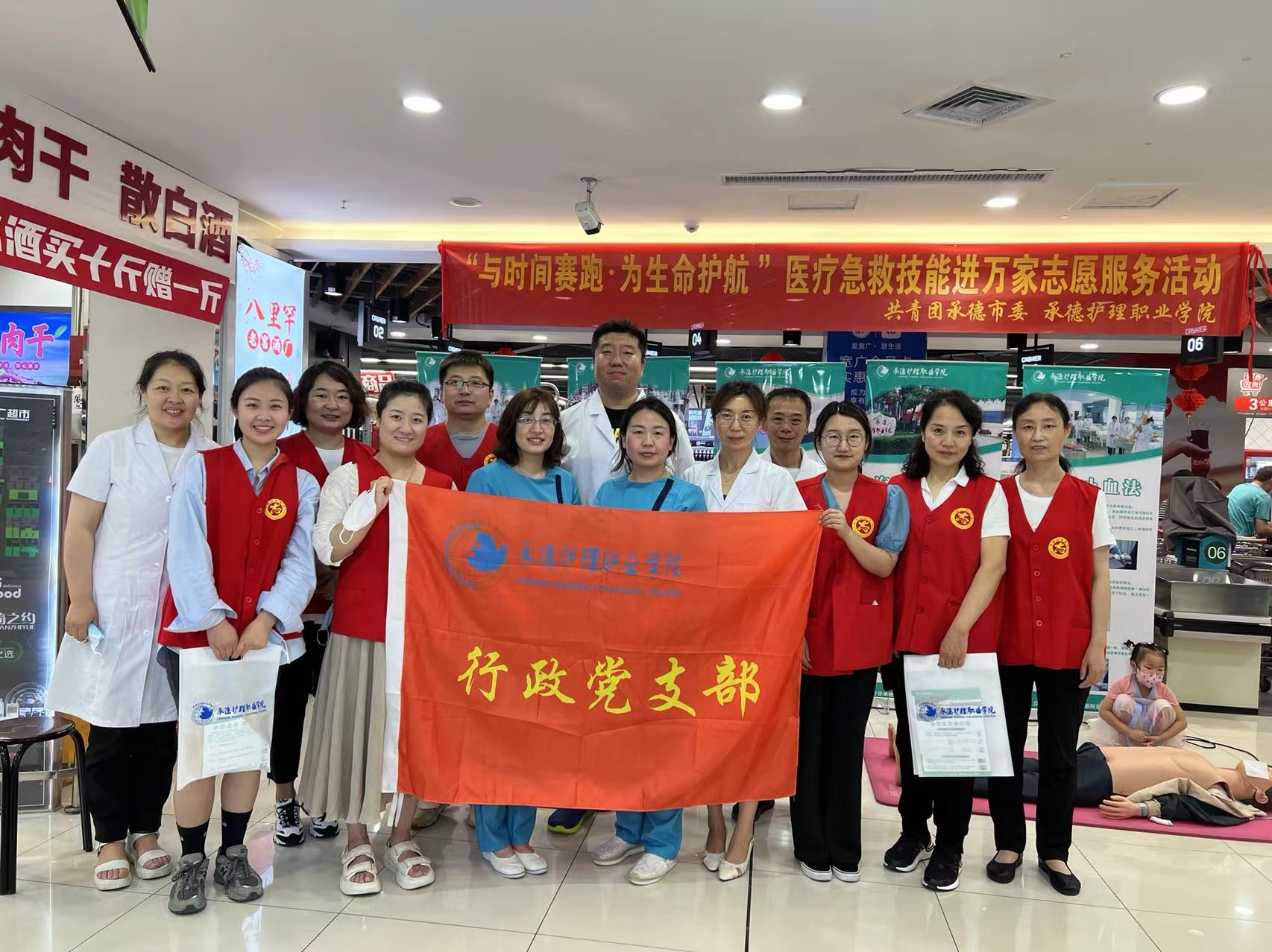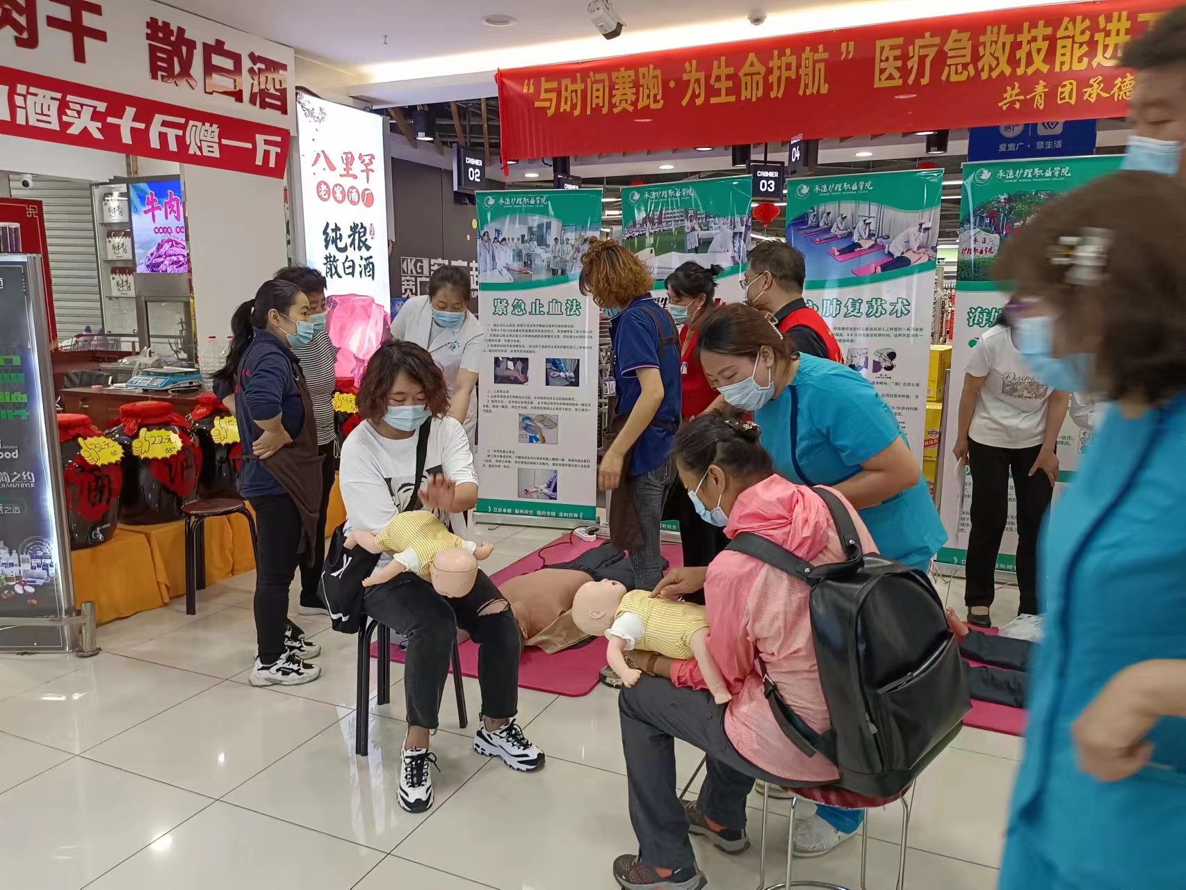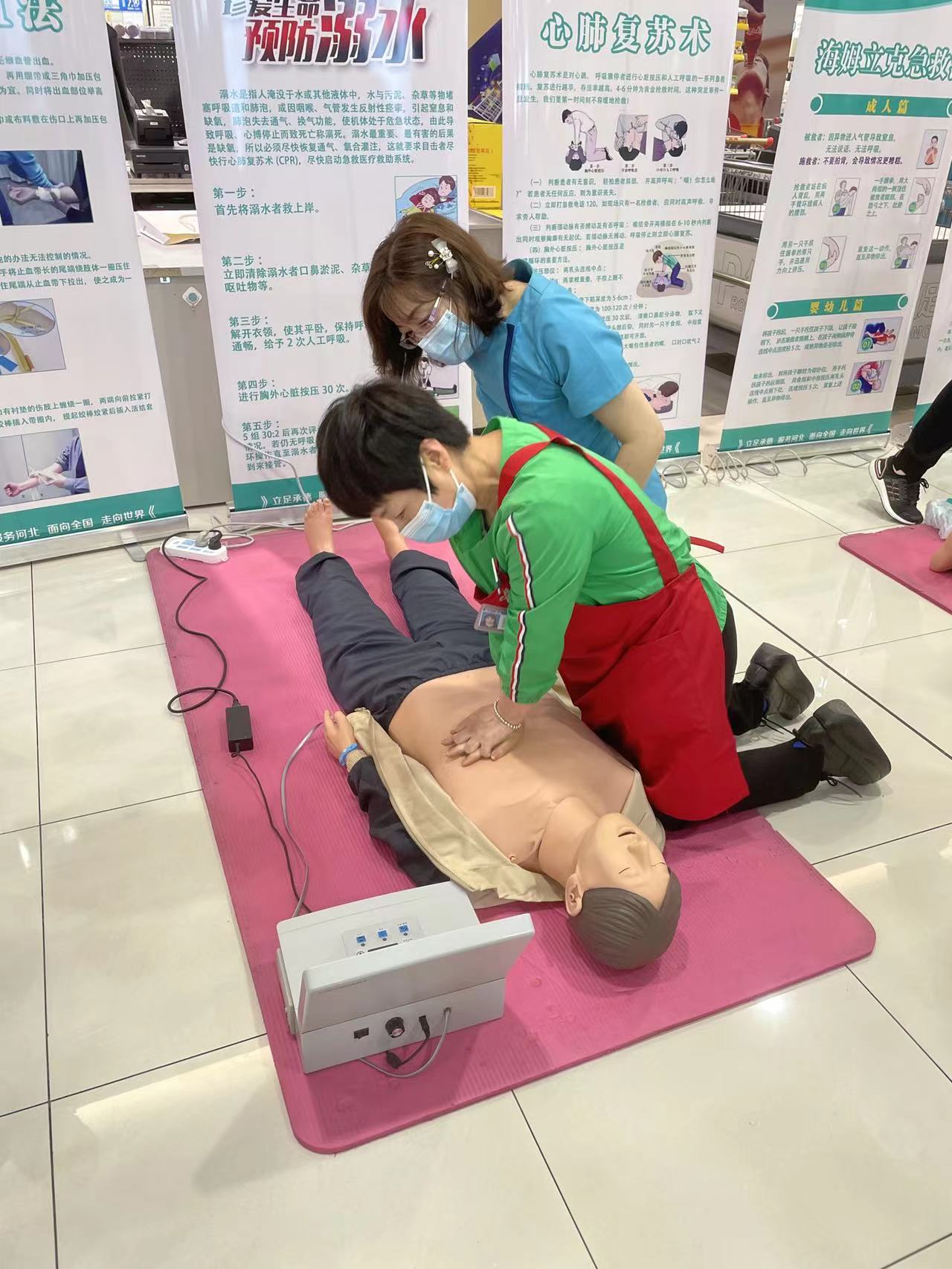 超市活动空间紧凑,人流量大,突发疾病等意外事件的发生率相对较高,为了能够及时施救、减轻减少伤害,志愿服务队对超市员工和往来群众进行急救技能培训,行政支部的党员志愿者向大家发放急救知识宣传单,外科教研室的教师志愿者通过现场讲解和医用人体模型的演示和实操,超市员工和往来人群学习掌握了心肺复苏、海姆立克急救、包扎止血等急救处置方法,纷纷表示这样的现场操作式的培训非常有意义,紧急情况发生的时候进行自救互救可能就会为下一步的专业救治赢得宝贵时间、挽救生命。