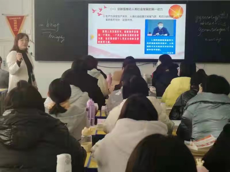 习近平总书记在学校思想政治理论课教师座谈会上强调:思政课是落实立德树人根本任务的关键课程。多年来,校党委高度重视立德树人工作,始终坚持为党育人、为国育才,校领导积极参与思政课程共建。11月15日上午,学校党委副书记、院长单伟颖走进21级涉外护理5班用中英双语为学生讲授“让改革创新成为青春远航的动力”主题思政课。