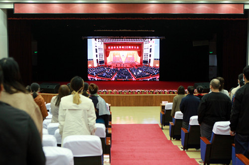 10月9日上午,纪念辛亥革命110周年大会北京人民大会堂隆重举行,中共中央总书记、国家主席、中央军委主席习近平出席大会并发表重要讲话。学校党委班子成员、全体在职人员在五楼会议厅集中收看大会盛况。