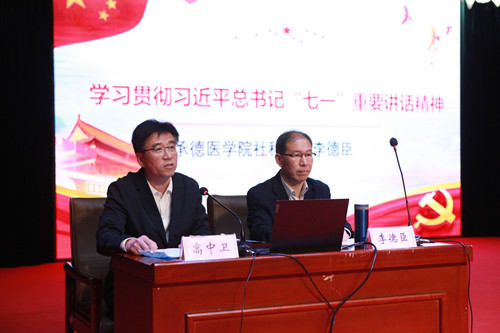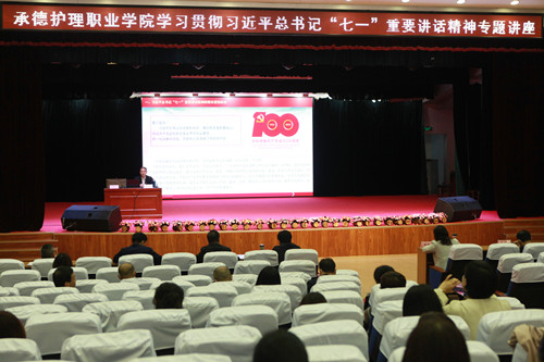 为进一步学习好、宣传好、贯彻好习近平总书记在庆祝中国共产党成立一百周年大会上的重要讲话精神,全面落实习近平总书记在承德考察时重要指示精神,9月30日下午,学校召开学习贯彻习近平总书记“七一”重要讲话精神专题讲座,邀请市委党史专家宣讲团成员、承德医学院社科部主任李德臣教授作专题讲座。党委班子成员、中层以上干部、全体教职工、学生党员、入党积极分子和优秀学生代表在主会场参会,辅导员(班主任)组织学生在教室收看直播。讲座由学校党委书记高中卫主持。