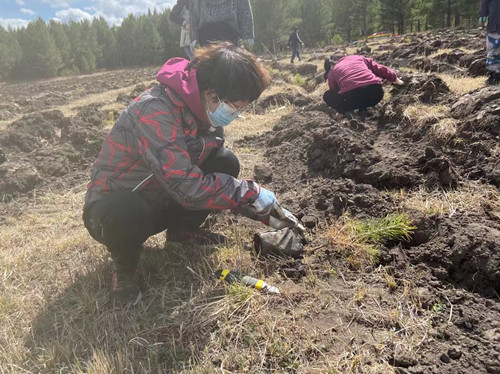 随后,全体党员来到三道河口林场神树库区植树造林,林场工作人员详细地介绍了树苗的种植步骤、工具使用方法以及注意事项,党员们认真聆听,生怕错过任何一个步骤影响成活率。栽植的过程更加辛苦,树埯要够深,土要经三遍压实,单膝跪地不方便就双膝跪地。最终,在大家的分工合作下,支部党员高质量栽植樟子松容器苗200余株,望着那一片亲手种下的小树苗,再看看周围那成长起来的万亩林海,耳边松涛阵阵,像在诉说着那一段可歌可泣的奋斗史,同志们也更加深刻体悟到老一代塞罕坝人的艰辛和无私忘我的奉献精神。