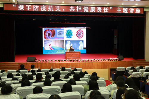 12月1日是第33个世界艾滋病日,今年的活动主题是“携手防疫抗艾、共担健康责任”。上午,承德市疾控中心副主任韩会强、承德市总工会基层工作部部长刘铁铮等二十余人来beat365与医务室、医学系师生开展“携手防疫抗艾、共担健康责任”主题活动启动仪式,学院党委委员、正处级组织员郝秀喜,后勤处处长乔国军、学院卫生所所长付生辉、医学系主任黄呈森与医学系600余名学生参加此次活动。活动以师生在“防艾”条幅上签名拉开序幕,市疾控中心工作人员还带来1000余份预防艾滋病宣传手册和800余份小礼品,同在场师生进行了有奖问答互动。