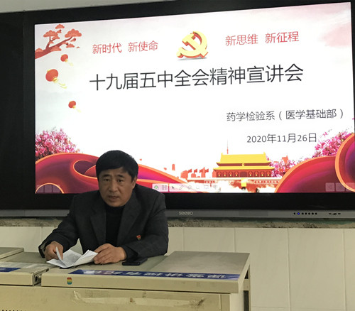 按照中央、省委、市委、学院统一安排部署,11月26日,学院党委委员、纪委书记王世震为药学检验系(医学基础部)全体党员作学习贯彻党的十九届五中全会精神宣讲报告。