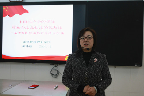 11月13日,党委副书记、院长单伟颖以“中国共产党的领导及社会主义制度的优越性—基于我国职业教育发展史视角”为题,在3号教学楼24教室为涉外护理系全体教师讲党课。活动由涉外护理系主任吕兴业主持。