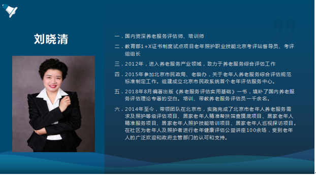 北京卫戍区朝阳第九干休所主任护师刘晓清利用6个学时,详细讲解了1+X老年照护职业技能等级证书实操考核(初、中级)评分标准及老年人身体评估的方法。刘主任精彩的讲授,受到广大学员的好评。