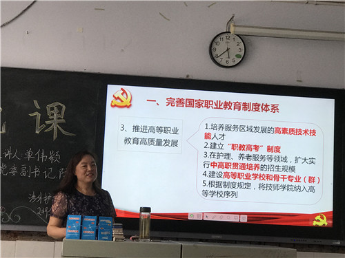 2019年6月26日下午,涉外护理系党总支组织开展了“不忘初心 牢记使命”主题教育党日活动。学院党委副书记、院长单伟颖以“习近平新时代中国特色社会主义思想及其对职业教育的启示”为题为涉外护理系党总支全体党员上了一堂生动的党课。