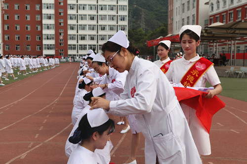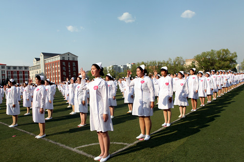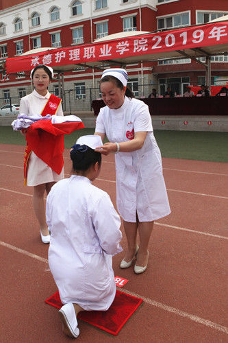 随后,在优美的音乐声中,来宾和学院从事护理教育的老师们亲自为即将走向实习岗位的1703名护理专业学生戴上燕帽。承德市妇幼保健院护理部主任金宝玲女士带领全体护生们集体宣誓,南丁格尔誓言响彻校园。