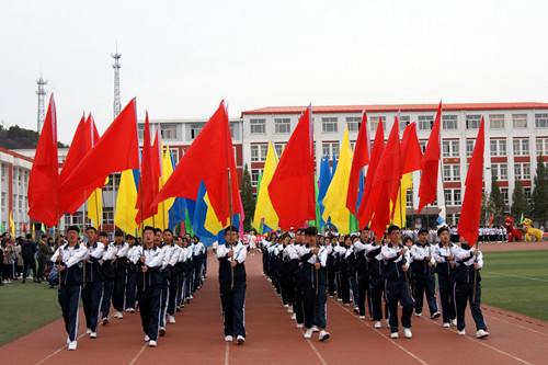 7点30分,伴着嘹亮的运动员进行曲,国旗队、校旗队和4个系的76个方阵依次走过主席台接受领导的检阅。各系方队身着各具特色的服装、迈着整齐的步伐、喊着代表班级精神的口号,用条幅、标语、气球、和平鸽等道具,展现了当代青年学生积极向上,开拓创新、追求梦想的阳光朝气。