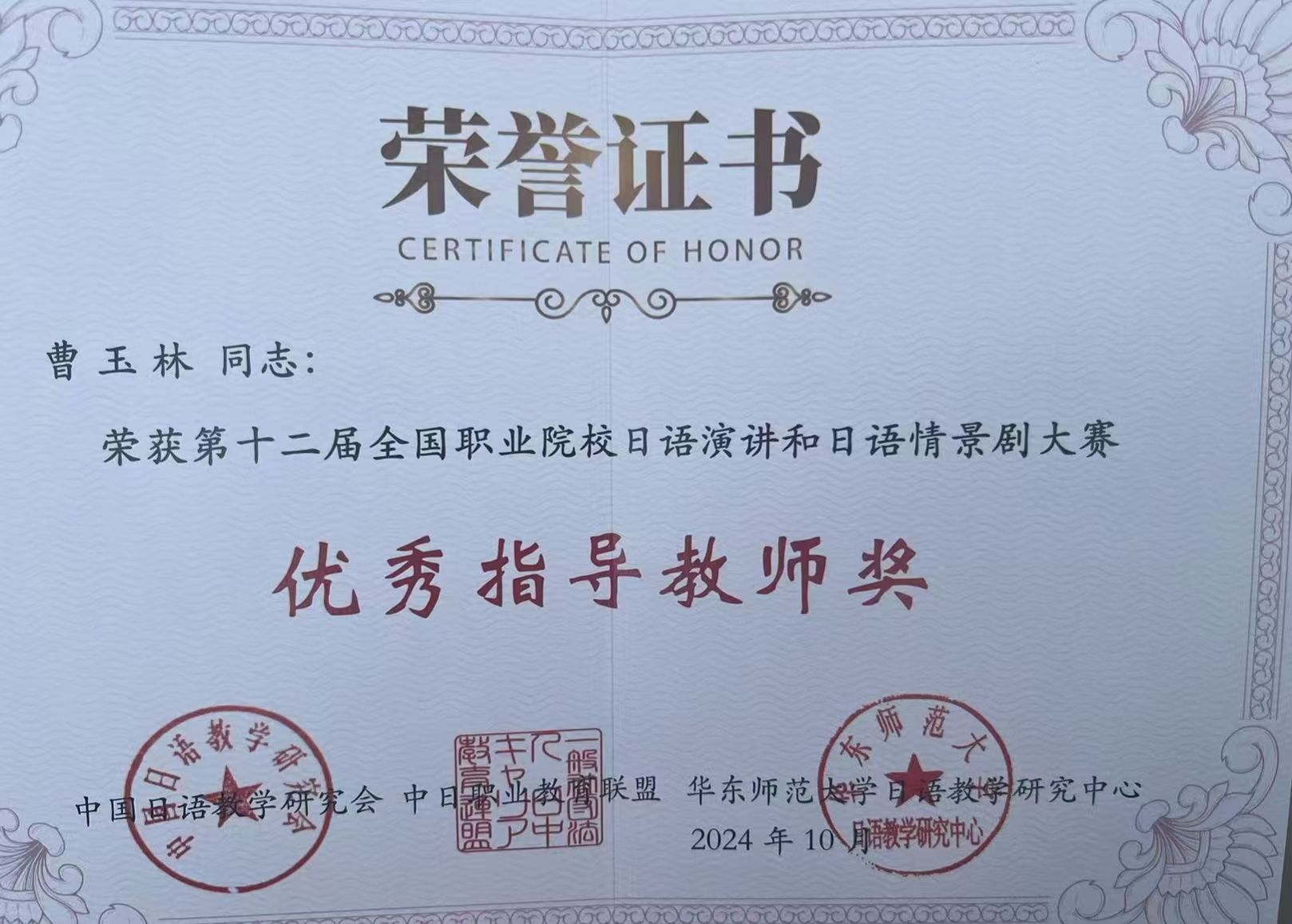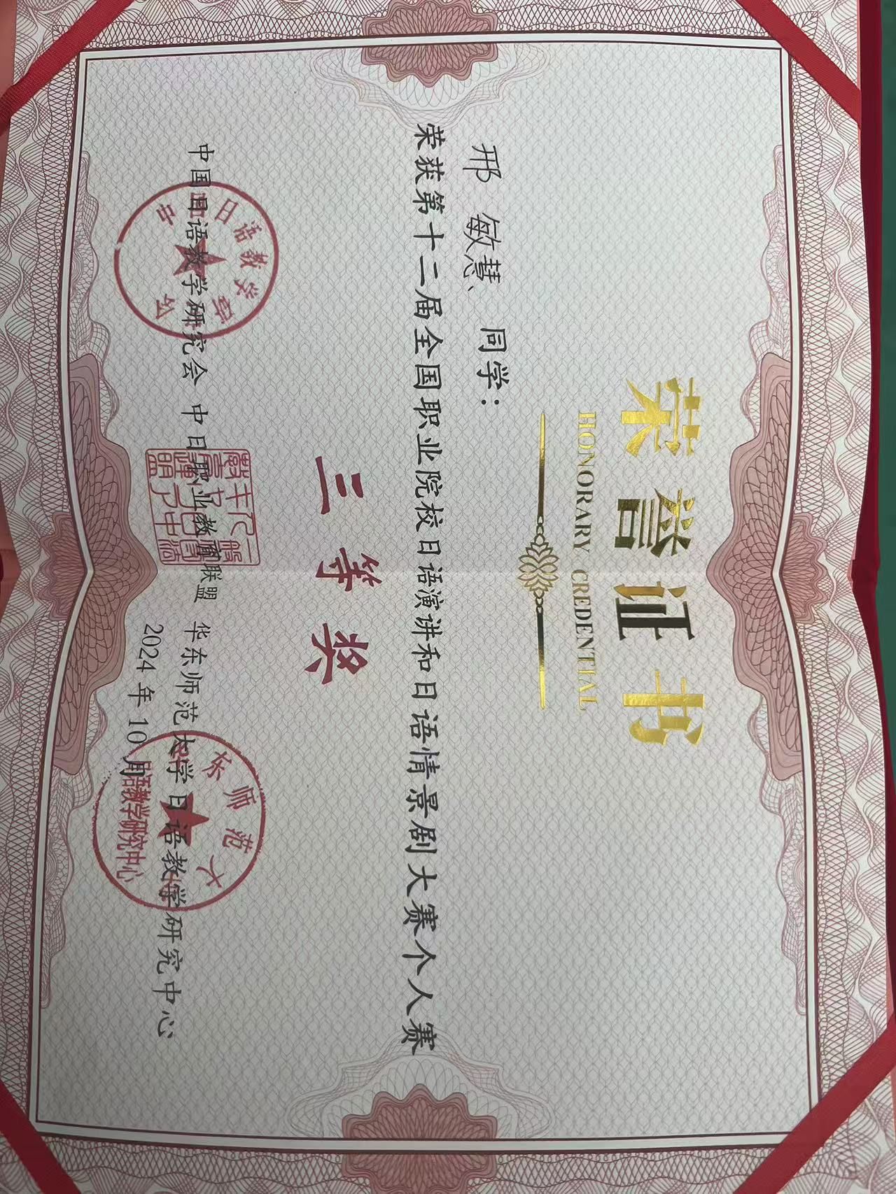 此次大赛由中国日语教学研究会、中日职业教育联盟及华东师范大学日语教学研究中心共同主办,是全国最大规模,也是目前国内唯一以职业院校日语专业学生为参赛对象的全国性赛事。本次大赛共有全国39所职业院校的200多名日语专业选手参加。大赛由个人赛项和团体赛项组成,其中个人赛项为命题演讲和即席问答。beat365参赛选手和指导教师们凭借不懈的努力、较强的实力和出色的发挥,取得了优异成绩。邢敏慧同学的演讲内容丰富,逻辑清晰,具有说服力,充分的展现了职业素养。