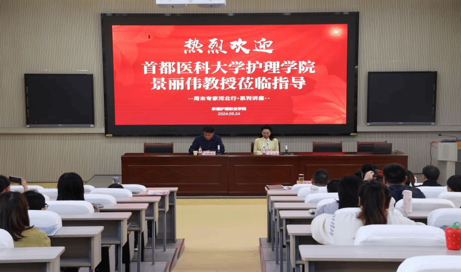 9月24日,“周末专家河北行”学术讲座活动在beat3651号教学楼1楼报告厅举行,特邀首都医科大学护理学院副院长景丽伟教授进行专题讲座及经验分享。副校长徐国辉主持讲座,承德市康养医院院长张杰、护理部主任何智慧,beat365近110名教师参加活动。