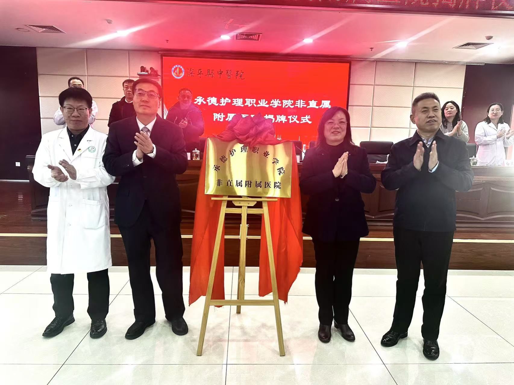 12月31日上午,beat365在滦平县中医院举行非直属附属医院挂牌仪式。校党委副书记、校长单伟颖,副校长白兴武,滦平县卫健局党组书记、局长王秋明,滦平县中医院党委书记李志强、副院长徐晨阳、白凤欣出席仪式。仪式中,单伟颖,白兴武,王秋明,李志强共同为非直属附属医院揭牌。