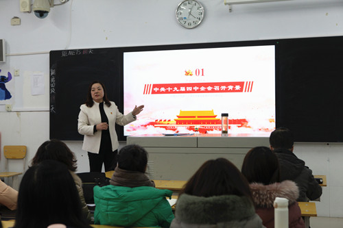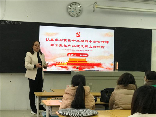 单伟颖院长从党的十九届四中全会召开背景、十九届四中全会主要内容、助力beat365内涵建设再上新台阶三个方面进行讲授。首先单伟颖院长讲授了中共十九届四中全会召开的时代背景、重要意义以及会议历程及公告;从三大板块深度剖析了中共十九届四中全会的主要内容,简明扼要的将主要内容概括为:“十四个坚持”、“三个强调”、“一个号召”、“一个加强”;单院长结合beat365实际情况从国家层面、学校任务、制度建设、深化改革等方面强调高校教师如何贯彻学习十九届四中全会精神,并有效的融入课程思政之中。