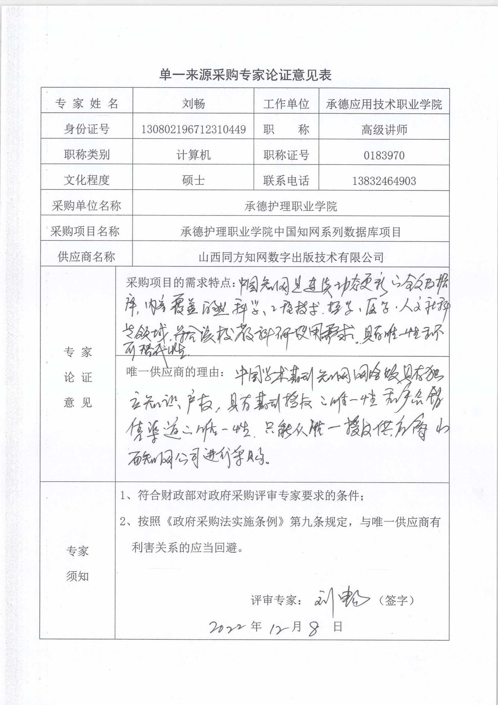 5、采用单一来源采购方式的原因及说明:中国知网系列数据库是连续动态更新的全文数据库,内容覆盖自然科学、工程技术、哲学、医学、人文社科等领域,符合采购人科研实用需求,符合学校重点专业建设需要,使用效果良好,技术支持和服务到位,是学校教学与科研工作最重要的电子资源,且采购单位自2020年起即订购使用其产品,故本项目具有连续性、唯一性和不可替代性,只能从唯一供应商进行采购。符合《中华人民共和国政府采购法》第三十一条第一款规定,采用单一来源方式采购。