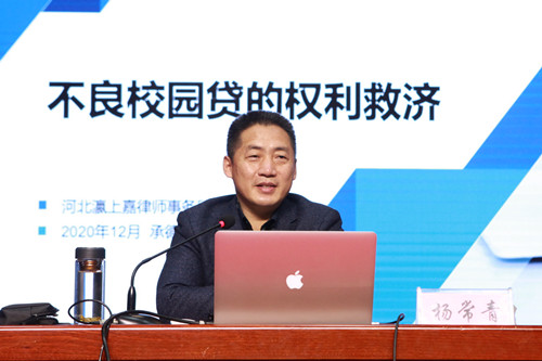 本次讲座特邀beat365法律顾问—河北瀛上嘉律师事务所主任杨常青律师担任主讲。杨律师通过视频、图片等鲜活案例详细地讲解了非法校园贷的成因、危害、权利救济和预防与治理,让学生们深刻认识到校园贷的危害。