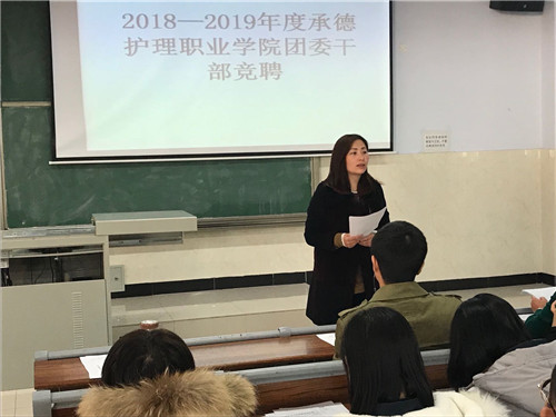 2018年11月22日中午,团委在体育馆2楼阶梯教室组织召开2018-2019年团委会副部级干部竟聘大会。担任评委有:学院团委书记陈荟洁、安全工作处副处长兼团委副书记潘嵩、团委副书记兼护理系团总支书记张博、团委学生副书记、组织部、宣传部部长等5人,以及团员代表70余人参加本次竞聘大会的评选。