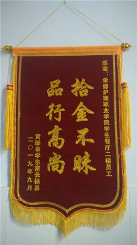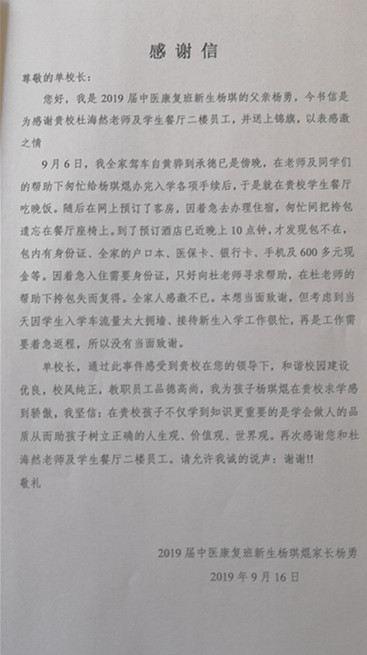 2019年9月16日,距新生开学报到已经十天,学院党委副书记、院长单伟颖同志收到了一封家长来信和两面锦旗,一面是送给学院餐厅,一面是送给杜海然老师。学生家长以这个传统的方式表达了对学校教职员工的感激和对学校的信任。