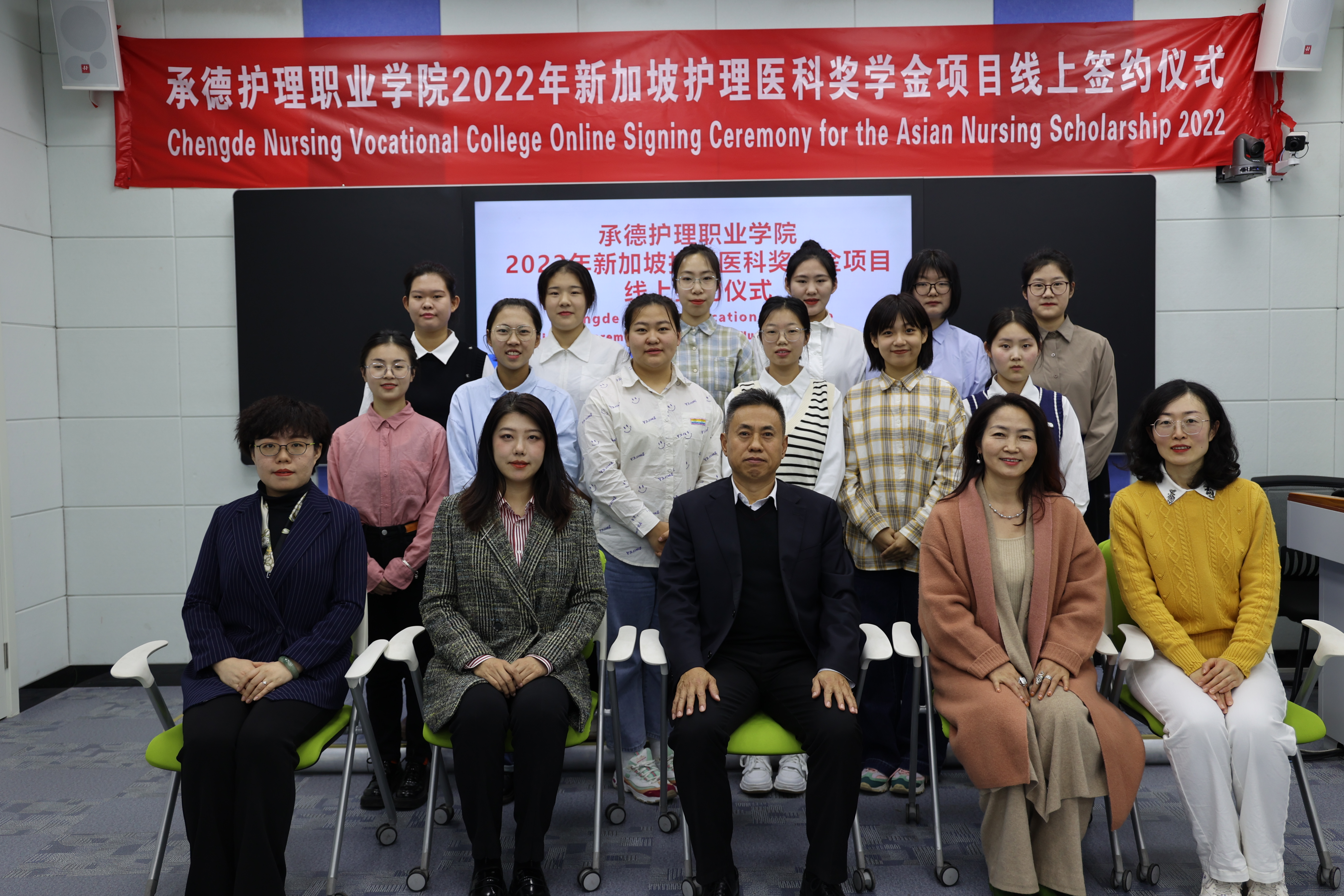 继续教育与国际交流中心、项目团队以及12名学生和24名学生家长在线上参加签约仪式。签约仪式结束后,白兴武与项目团队成员和12名奖学金学生合影留念。