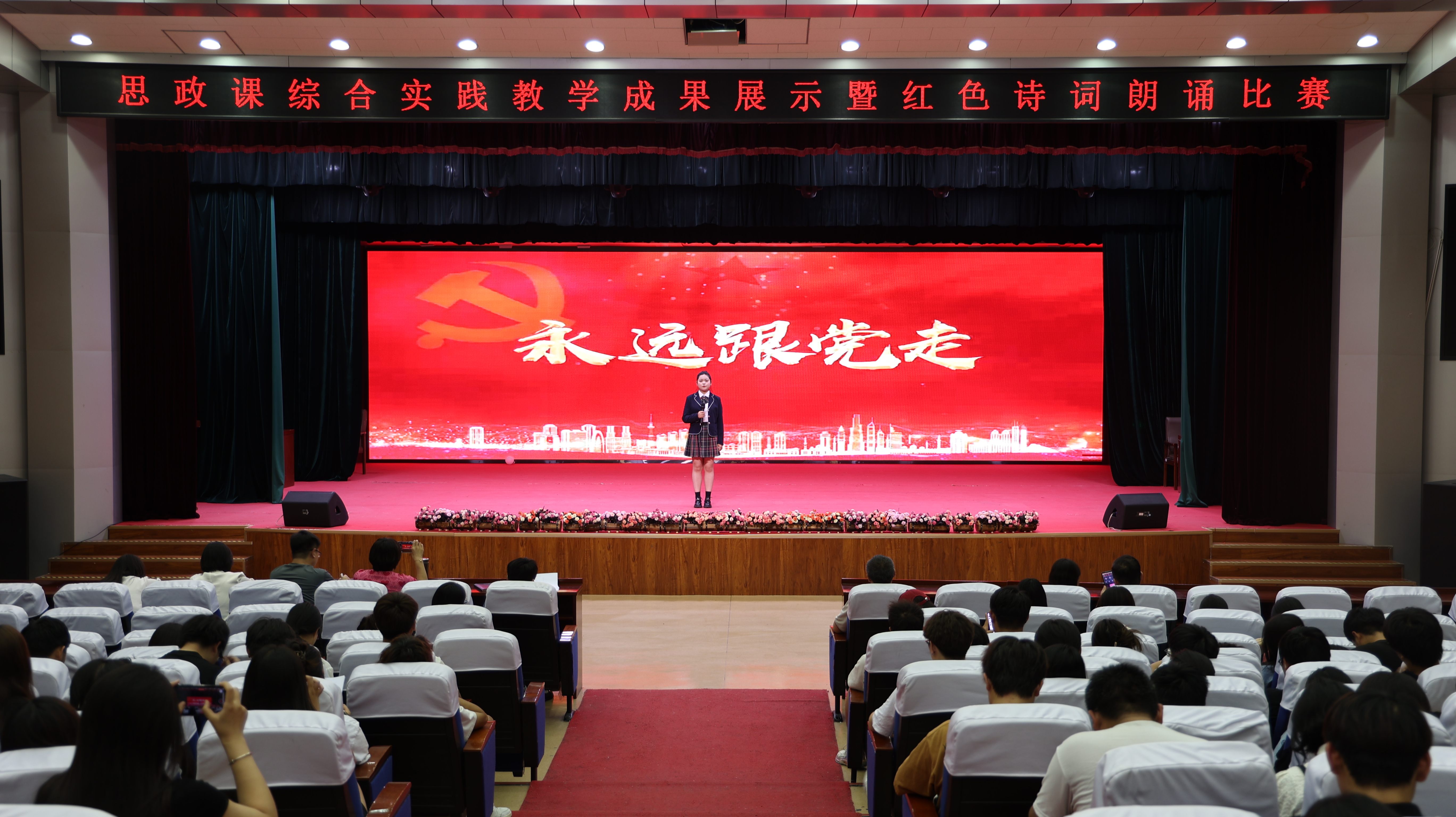 为深入学习贯彻习近平总书记在学校思想政治理论课教师座谈会的重要讲话和新时代学校思政课建设推进会的指示精神,在中国共产党成立103周年之际,7月2日,学校举行思政实践课成果展示暨红色诗词诵读比赛。宣传部(统战部、工会)、学生工作部(团委)、教务处、基础部等部门领导、思政部全体教师及学生代表现场观看。