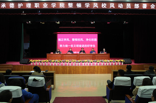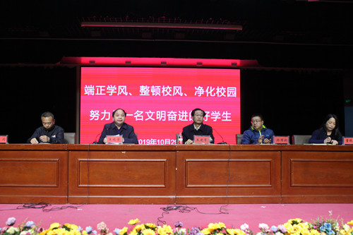 为贯彻落实党的十九大精神及《中共中央国务院关于进一步深化教育改革全面推进素质教育的决定》,全面落实“不忘初心,牢记使命”主题教育整改方案,10月29日,学院在五楼会议厅组织召开了以“端正学风、整顿校风、净化校园,努力做一名文明奋进好学生”为主题的整顿学风校风动员部署会。各系党总支副书记、学工干事、辅导员班主任、学生处工作人员、各班班长、院系学生会干部参加会议。学生处副处长王瑞学主持会议。