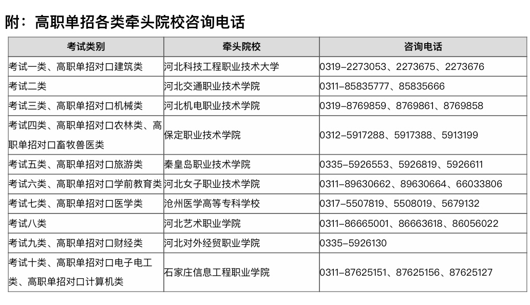 高职单招志愿填报采取网报形式,考生需在规定时间内登录河北省高职单招服务平台(http://hebgzdz.sjziei.com,以下简称单招平台)填报志愿。实行平行志愿填报方式,设集中志愿和一次征集志愿。考生在牵头院校规定时间内登录“单招平台”填报志愿,每次填报志愿可在同一考试类中选报5所院校,每所院校最多填报6个专业及是否服从专业调剂选项,不得跨考试类填报。考生如有疑问,可向所报考的考试类牵头院校咨询(咨询电话附后)。