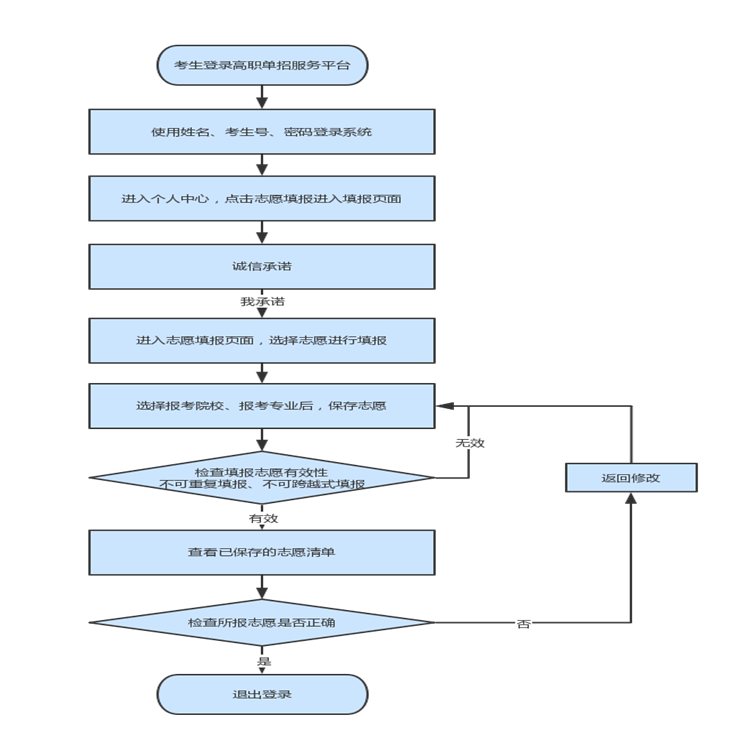 完成我省2023年高职单招报考的考生,方可填报志愿。考生登录“单招平台”后,进入“个人中心”,点击“志愿填报”进入志愿填报系统。具体操作流程如下: