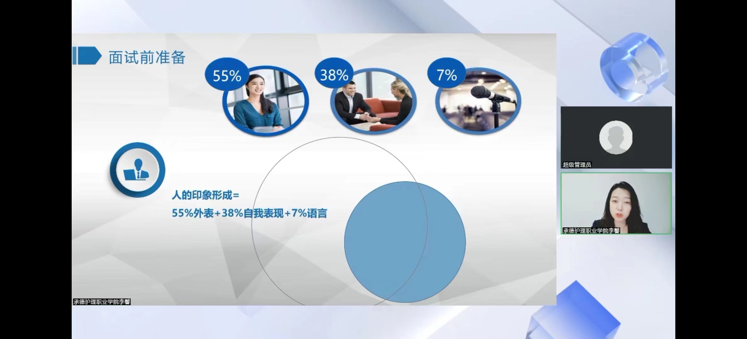 为提高学生就业综合素质和面试技能,增强学生就业自信心和面试竞争力,6月20日晚19:00,学校招生就业处举办“毕业生应聘礼仪与面试”直播课。讲座邀请学校科研中心副主任李馨副教授主讲。本次讲座由招生就业处副处长陈荟洁主持。各系领导、辅导员班主任以及2023届毕业生100余人参加线上学习。